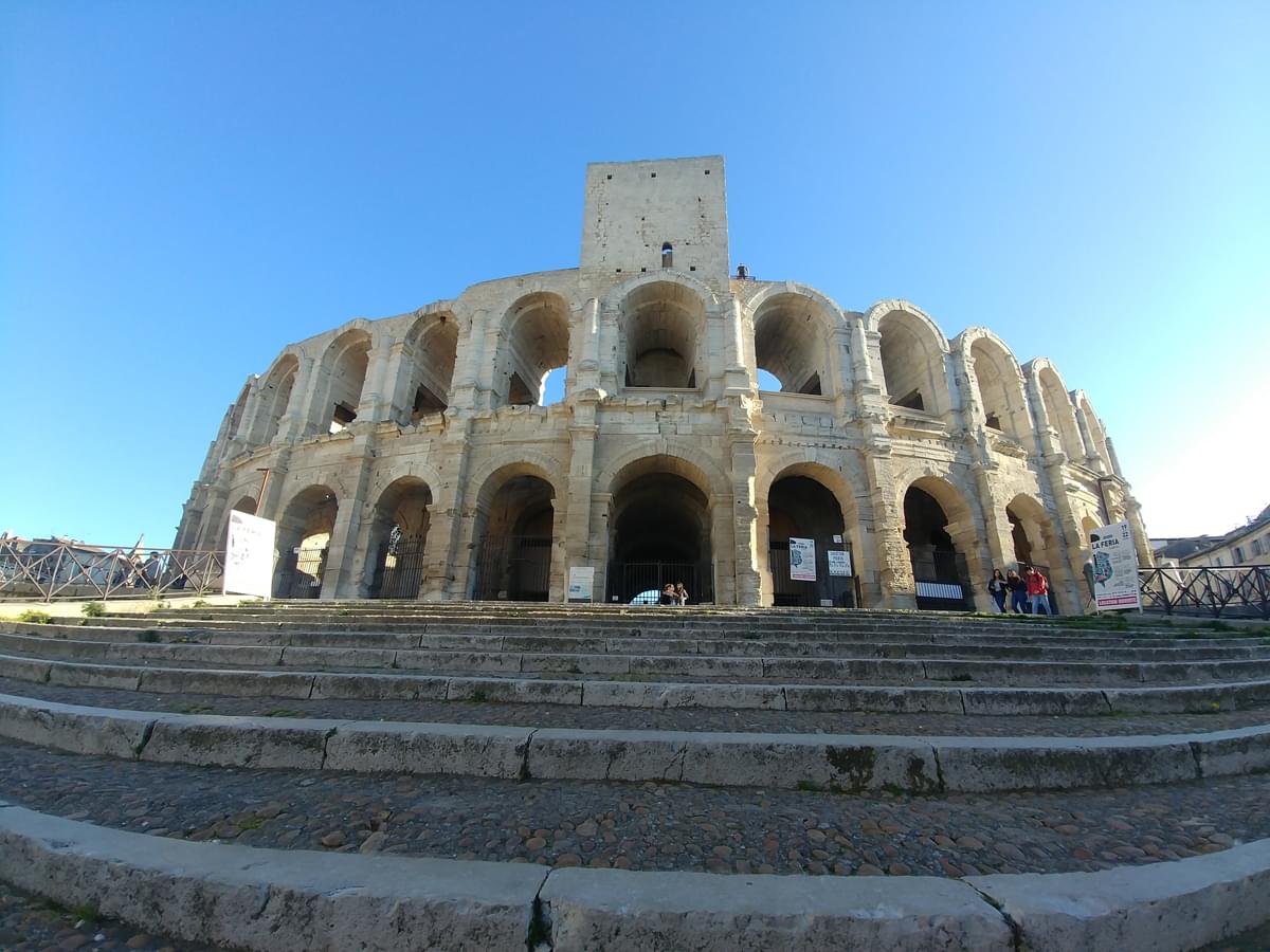 L’amphithéâtre est extrêmement bien conservé. Du haut de sa tour principale, le regard s’étend très loin au-delà des toits d’Arles, jusqu’aux Alpilles ; cette vue vaut le détour à elle seule. Pour revenir à l’amphithéâtre, son surnom des « arènes » n’est pas fortuit en ces terres de Camargue : il s’y déroule toujours des corridas et courses de taureaux.