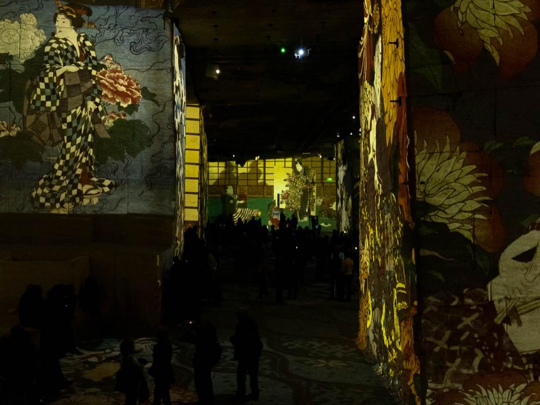Une première fin. Après 45 minutes entourés par l’oeuvre de Van Gogh, nous voilà plongés dans un voyage au Japon ! Un Japon rêvé, celui des samouraïs et des geishas. Alors que les visiteurs, en partance, s’arrêtent et reviennent sur leurs pas, un nouveau monde émerge des murs.