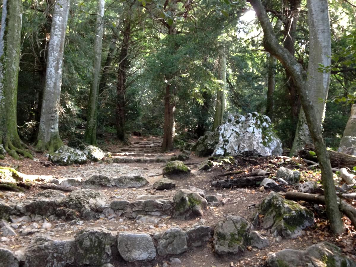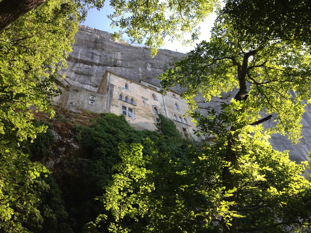 L’ascension au travers de cette forêt se fait en douceur et le sanctuaire finit par apparaître à travers le feuillage. Le sentier se termine par un escalier de 150 marches qui permettent de gravir la falaise. Au niveau de la première marche, l’altitude est de 860 mètres.