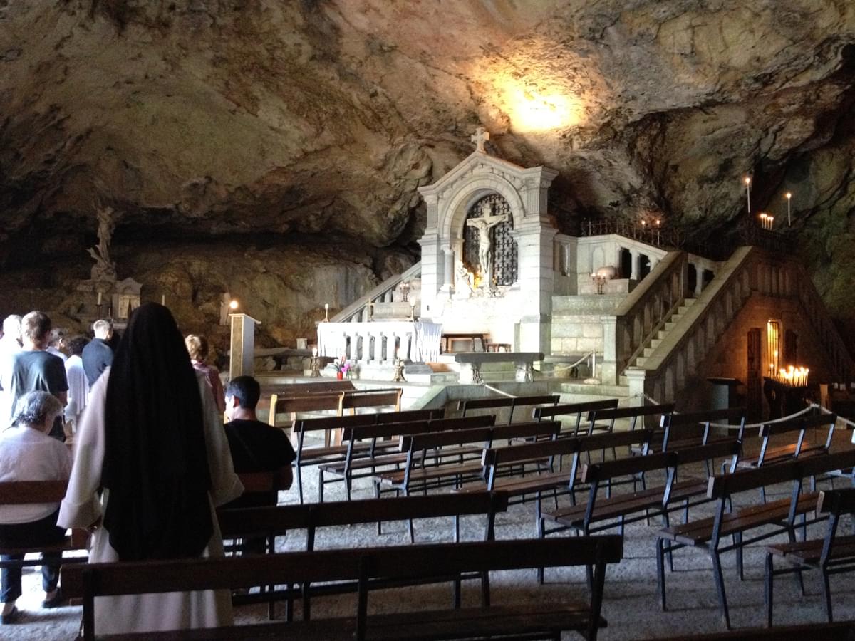 Lorsque nous entrons dans la grotte, nous pouvons constater qu’elle a été aménagée en une église, dans laquelle se déroulent des offices. Des ex-votos ornent les murs.