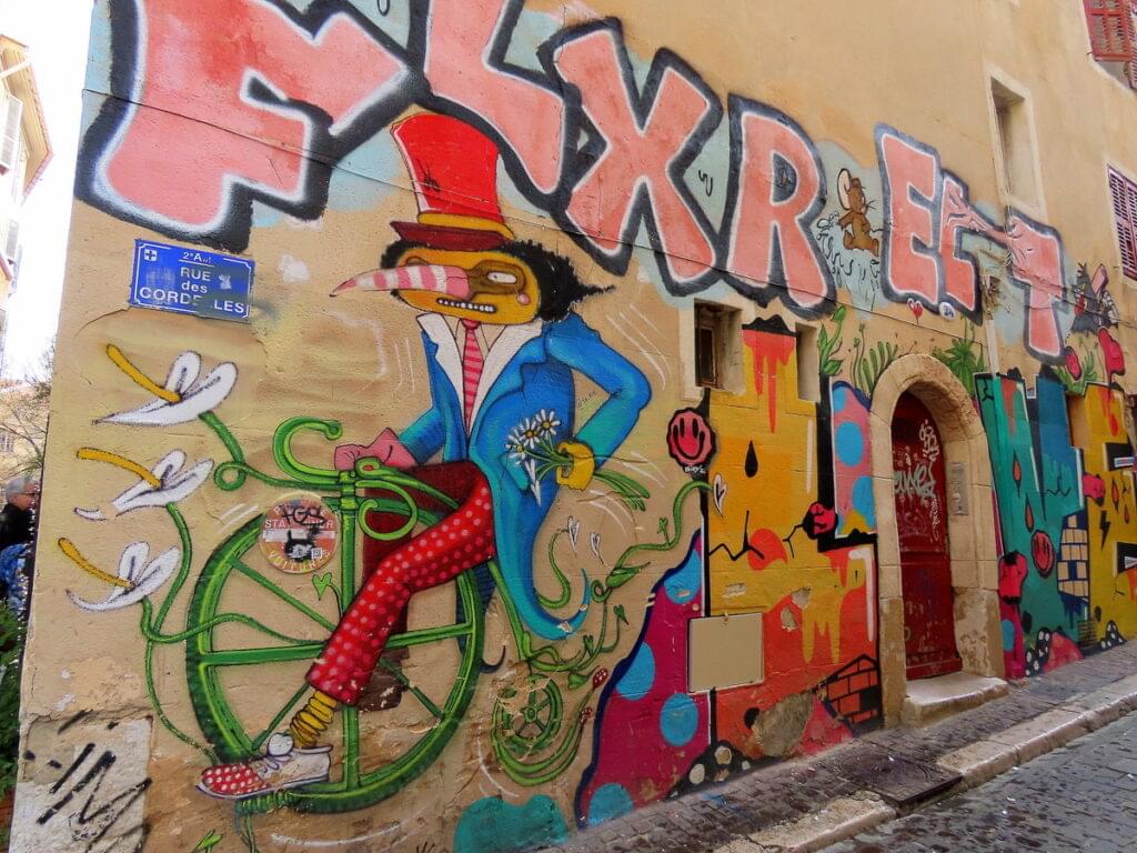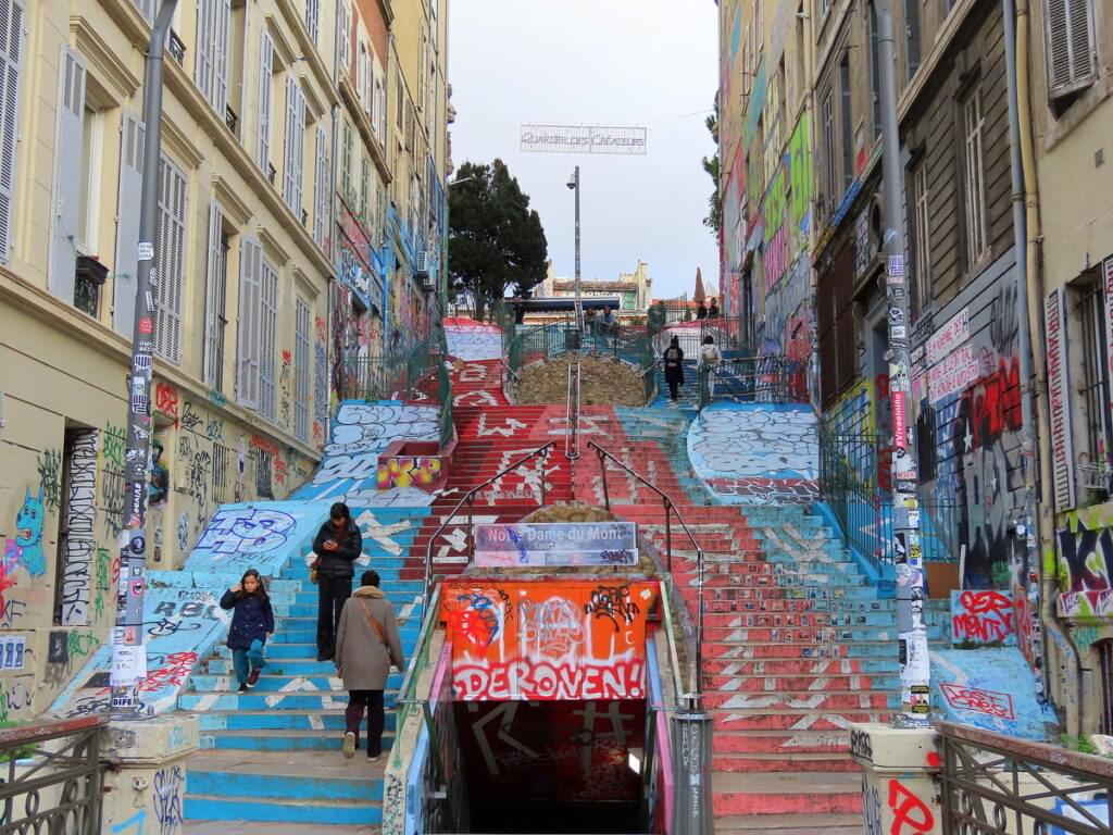 Intimement reliée à la culture hip-hop, la ville de Marseille est un peu le berceau du Street Art en France. Les premiers artistes de rue y déploient leurs couleurs dès les années 80. Apparu en premier lieu sur les murs du Cours Julien, le Street Art a fait de ce quartier le rendez-vous branché de tous les acteurs culturels de la région. On y accède par le grand escalier coloré qui monte vers la butte et qui donne instantanément le ton à la visite.