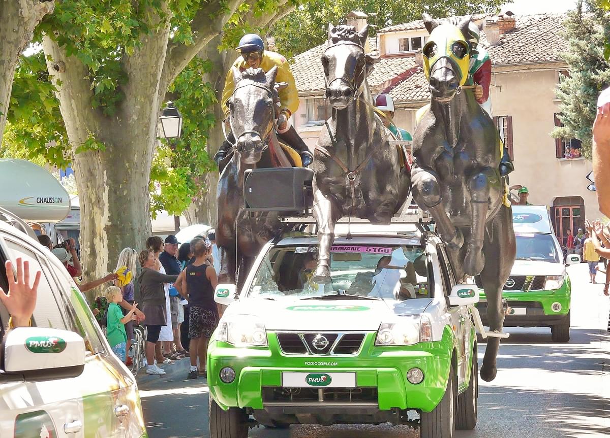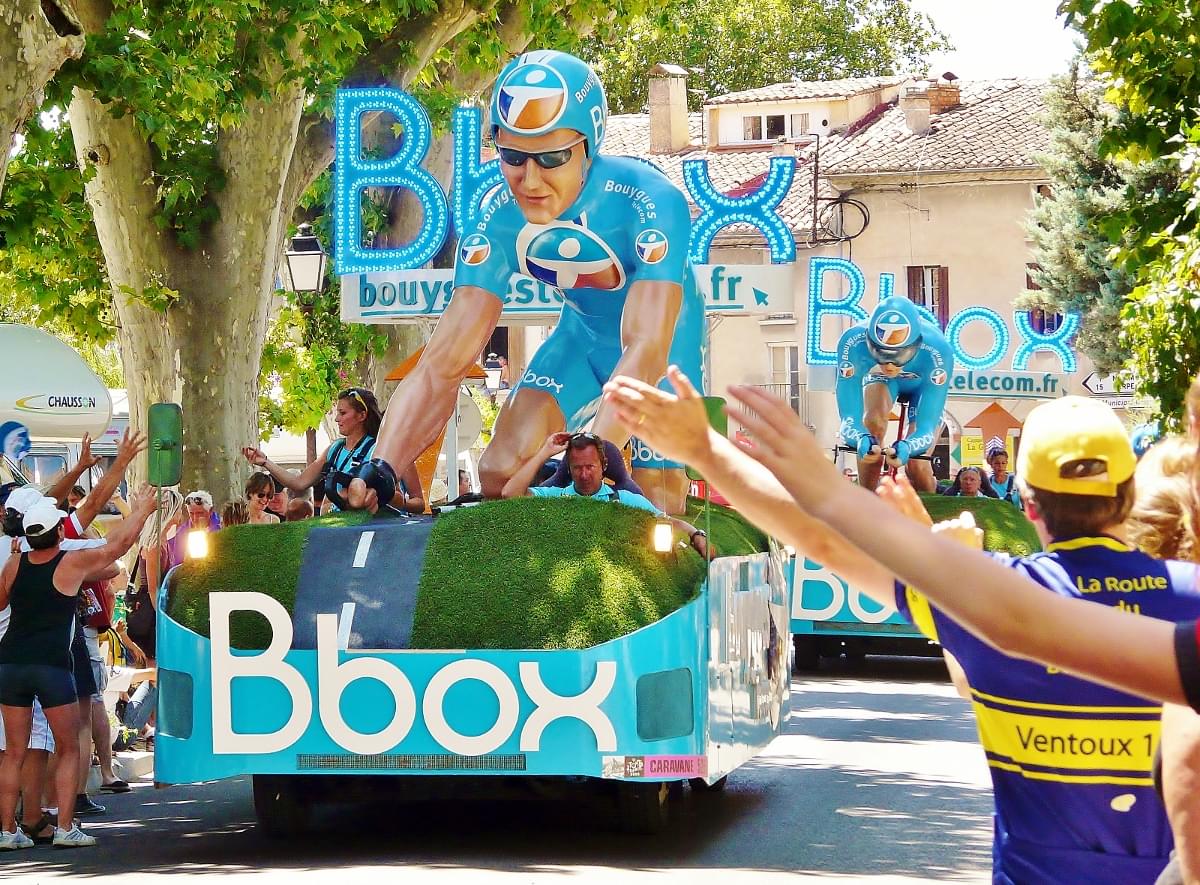 Avant le passage des coureurs, environ 2h avant, il y a le passage de la caravane. La caravane publicitaire est un moment très sympa, où des voitures/camions balancent des goodies, mette de la musique et de l’ambiance. Les enfants vont adorer !