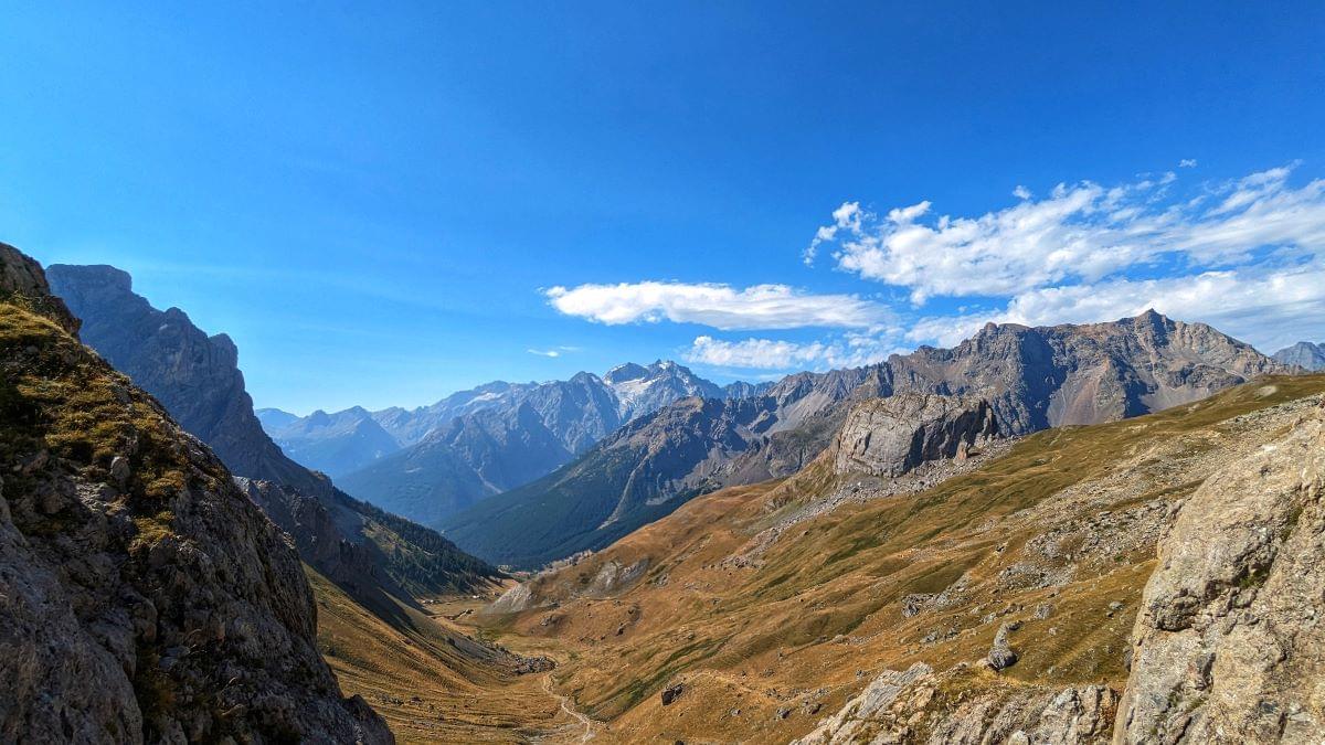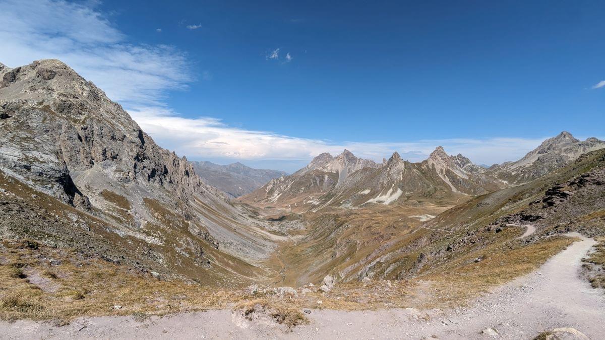 De là, ça continue à monter sur 4 kilomètres et 300 mètres de dénivelé pour atteindre le Col de la Ponsonnière (2613 mètres ). Le panorama y est grandiose sur le Massif des Écrins : le Mont Pelvoux, la Barre des Écrins, le Pic des Neige Cordier, la Meije, le Rateau et plus encore.