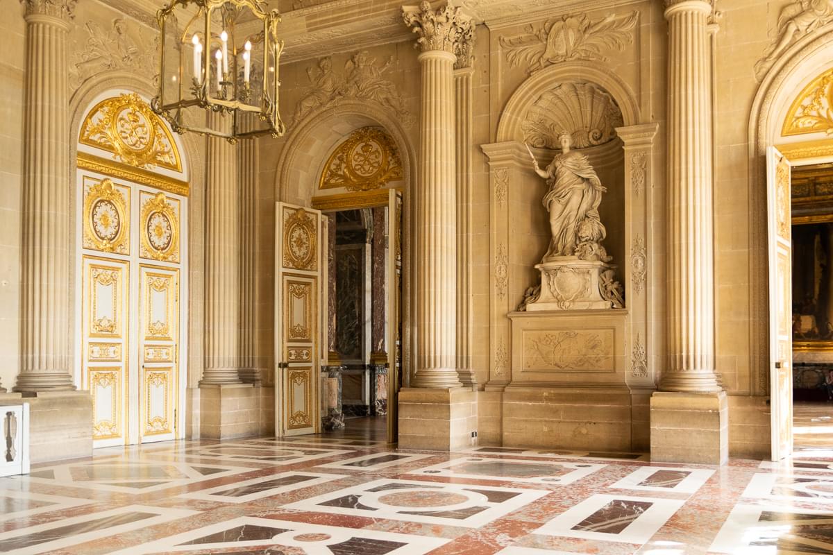 Une scène de toute beauté vous attend au salon d’Hercule. Le peintre François Lemoyne a réalisé ce plafond en trompe l’œil sur une surface de 230 mètres carrés dont les 140 personnage et cette magnifique teinte bleu outre-mer en font la première grande réalisation artistique sous Louis XV. Nommé premier peintre,il se suicide peu après, endetté de 29000 livres. Ce bleu si particulier lui a coûté 24000 livres alors qu’il fut rémunéré de 10000 écus pour réaliser sa peinture.